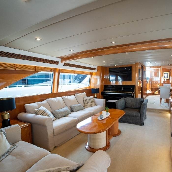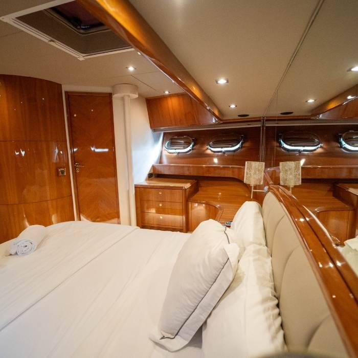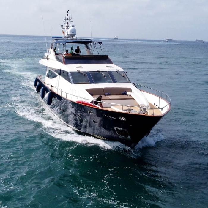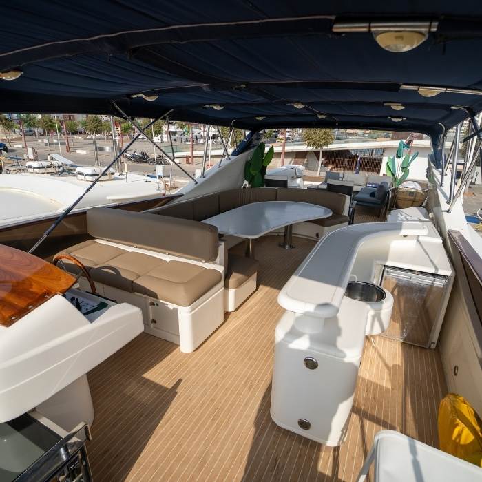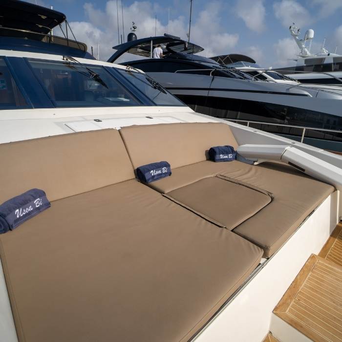 Sus generosos soláriums en proa y popa, junto a su plataforma de baño y equipamiento completo, convierten cada jornada a bordo en una experiencia exclusiva, cómoda y memorable.