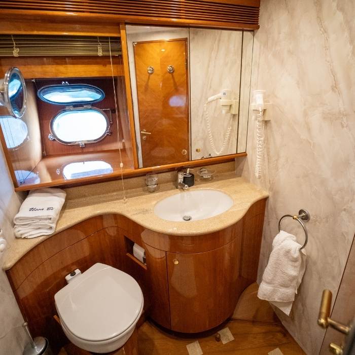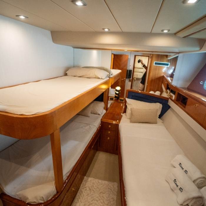 Cuenta con 4 camarotes y 5 baños completos, permitiendo alojar cómodamente hasta 10 personas en pernocta y 12 personas en salidas de día, con una distribución pensada para la privacidad y el descanso.